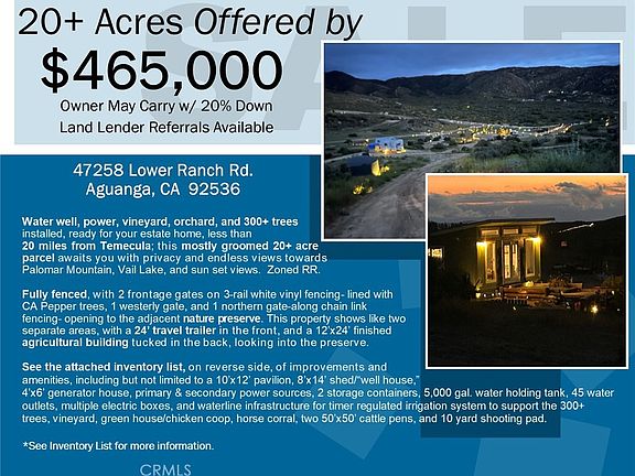 Water well, power, 24' Fifth Wheel Travel Trailer, vineyard, orchard, and 300+ trees installed, ready for your estate home, horses, etc. Less than 20 miles from Temecula; this mostly groomed 20+ acre parcel awaits you with privacy and endless views towards Palomar Mountain, Vail Lake, and the Santa Rosa Plateau. Zoned RR. Elevation about 2,500.
