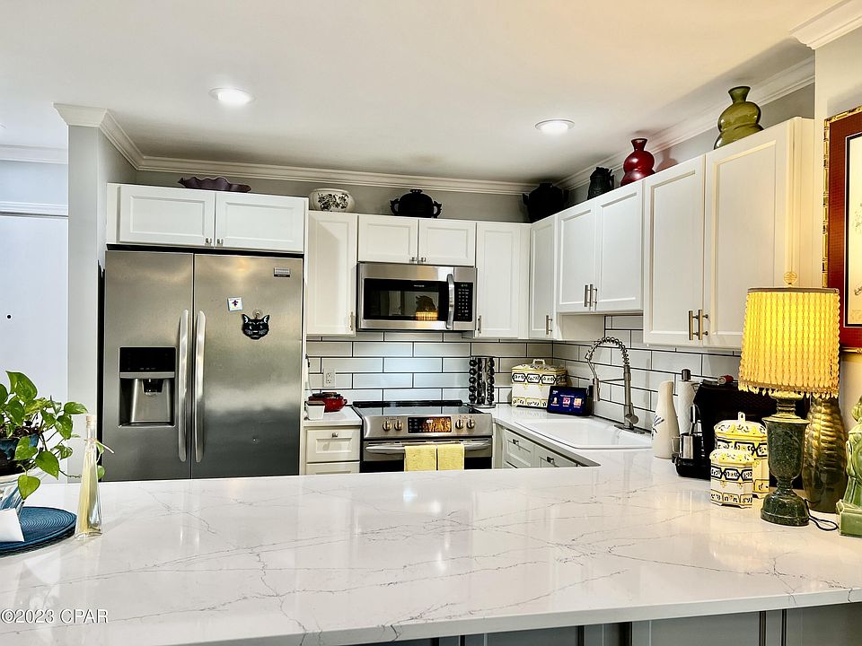 What a beauty... and the seller is motivated! This ground level fully remodeled villa has been transformed from the stud walls out! With all new wiring, electrical, extra insulation, plumbing, down to the sheet rock. The desired finishing touches like soft close cabinetry, crown moulding, LVP flooring through out the entire home, and a tiled walk in shower are a few of the touches that we all look for when looking for a home. This has been a primary residence for the seller and does have the capability of sleeping six as a short term rental if you're desiring an affordable investment property. It does come partially Furnished so you just need the final touches to make it your own. The 16x16 large back patio is an oasis of its own nestled under mature trees at the back of the home you can rise with a cup of coffee to enjoy the sweet sunshine in the morning or afternoon nap in the shade while gazing out over the golf course. Harbour Villas is in the gated community of Bay Point and sits between the Jack Nicklaus Golf Course and Point South (Bay Point) Marina on the Grand Lagoon. Out the front door you catch a limited view of the water at the marina your that close! Giving you a relaxing life style with many options here in Panama City Beach lets make this your new home. Schedule your showing today at this price it won't last long!