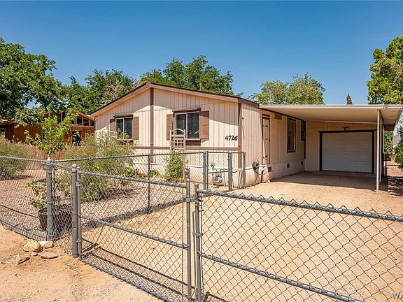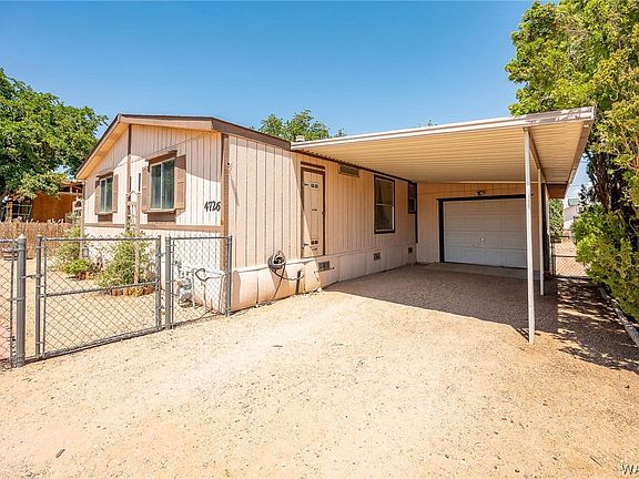 A true oasis during the dog days of summer! This cool & cozy 3 bed, 2 bath manufactured home sits on .14 acres of shaded greenery. At 1,240 square feet, you're first greeted by a spacious living room that's served by a breakfast bar from the kitchen. Two bedrooms and a guest bathroom are on your right and facing the Arizona sunsets. To your left, you'll find the primary bedroom with en-suite, and a quite spacious closet. Through the kitchen, you step into the laundry, and through the back door takes you into the one car garage. The backyard is accessed via a walk-through gate just to the south of the garage, or with a double drive-in gate through the alley. This lovely home is located near Mohave Community College and is just a hop, skip, and a jump, from Stockton Hill Road to get you any place in town in short order!