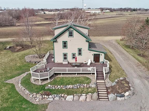 Welcome Home! This 4 bedroom, 3+ bath is located on 2 acres on the edge of town. This home features original maple floors throughout, custom woodwork including the red oak kitchen cabinets with the large island and walk-in pantry. Updated bathrooms. Spacious living and family rooms all on the main level. This home has 3 bedrooms + office on the 2nd level, and 2 stair cases! The spacious Master suite is your own retreat on the 3rd level! It features a walk-in closet with custom closet organizer, 3/4 bath with jetted tub, custom maple/black walnut doors, trim and vanity. Enjoy the large deck for all of your entertaining and the front porch for amazing sunsets. 40x34 Pole Building is insulted with in-floor heat, exterior water hydrant, Phase 3 electric, 12' & 10' overhead doors. Detached insulated 2+ car garage with cold storage. There's no shortage of storage in this home!