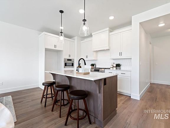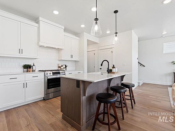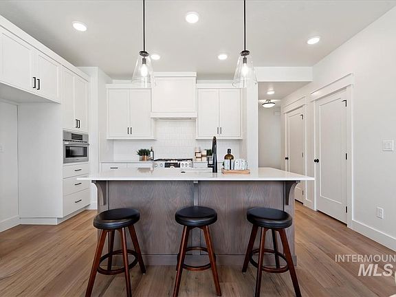 Staged & Move-In Ready Berkeley's philosophy has always been "more thought per sq ft.” Located in desirable NW Meridian, 1/2 mile West of a plethora of shopping, dining & entertainment options is The Daphne- a low maintenance townhome community consisting of 28 homes incl: This very popular BEVERLEY floorplan featuring the "MOUNTAIN VISTA W/ALABASTER" interior design package. Fully fenced & landscaped, filled with high quality amenities uncommon in this price point: Bosch Appliances, quartz countertops, custom cabinetry, designer light fixtures, LVP Flooring, curated tiles & colors, with abundant windows that amplify the open living space. Enjoy room to grow in the large secondary bedrooms, spacious primary suite w/oversized master closet & bath featuring a beautiful tiled shower + UPSTAIRS LOFT & "oversized" two car garage with extra room for storage.