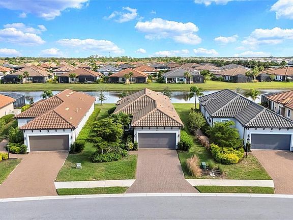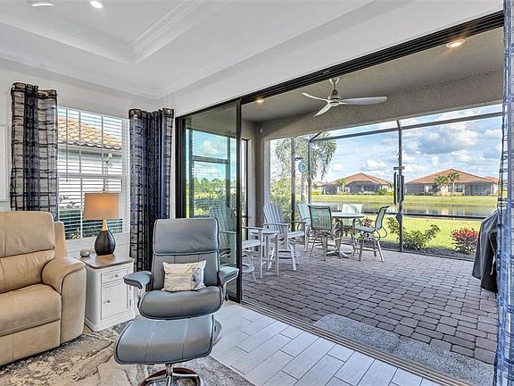 UNBEATABLE OPPORTUNITY FOR A GOLF HOME IN AZARIO — EVEN COMPARED TO THE NEW BUILDS! This beautifully designed Roma floorplan sits on a golf-deeded homesite and offers an inviting, serene lifestyle. Ideally located on a quiet dead-end street, the home is just steps from the smaller community pool and near the main community entrance for exceptionally easy access in and out. Start your mornings on the extended covered lanai, taking in peaceful lake views as the sun comes up. Inside, the home features two spacious bedrooms, a separate den/office, and an open layout that feels both warm and modern. It’s truly move-in ready, highlighted by wood-look ceramic tile, elegant tray ceilings, 8’ doors, and a generous laundry room. The home comes with ceiling fans, mounted TVs, and window treatments already in place. The gourmet kitchen showcases upgraded appliances and rich wood cabinetry. Additional enhancements include a gas water heater, AC UV purification system, and an epoxy-finished two-car garage with an extended 4-foot bump-out for extra storage. For peace of mind, the lanai features a motorized hurricane screen for storm protection. Located within the highly desirable Esplanade at Azario in Lakewood Ranch, this community delivers a true resort-style lifestyle. Residents enjoy access to a championship golf course, aqua range, short-game practice area, and putting greens. Sports lovers will appreciate courts for tennis, pickleball, and bocce. The newly opened Culinary Center—approximately 15,000 sq ft—offers an elevated dining experience with world-class hospitality. At the Wellness Center, indulge in spa treatments, massage therapies, skincare services, and personalized fitness and nutrition support. A variety of fitness classes, aquatic programs, and premium spa packages are available. Relax poolside or visit the popular Bahama Bar, where a full-service bar and restaurant bring the resort experience right to your neighborhood. End your day by the fire pit with beautiful views of the community’s outdoor spaces. This is luxury golf living at its finest. Don’t miss your chance—schedule your private showing today!