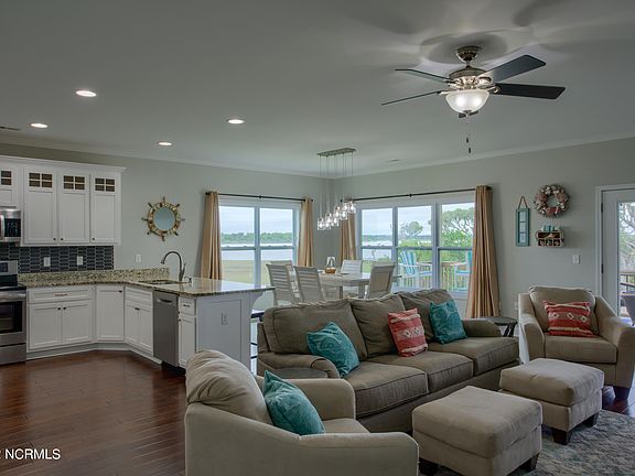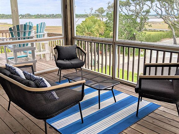 Stunning sound and salt marsh views from this tastefully furnished, like new 3 bedroom, 2 bath home in North Topsail Beach. Enjoy fabulous sunsets and even catch a great sunrise from the large screened in porch. This amazing outdoor living space is breezy yet protected and furnished with enough seating to accommodate a fun game on one side and a relaxing evening reuniting on the other. Fourth of July fireworks can be seen for long distances allowing you to create your own unique display. Inside, the home has an open living concept floorplan. The Primary bedroom has a large walk-in closet and there is enough additional space to dedicate to your office or fitness needs. 2 guest bedrooms, both with sound views, make a comfortable and relaxing place for family to retire for the night. Granite countertops , stainless appliances and large walk-in pantry/utility room with sink round out the amenities on the main living level. This home has weather entry and plenty of storage space underneath. Parking for multiple vehicles isn't a problem with tons of space in the carport and driveway. Call listing agent for additional details.