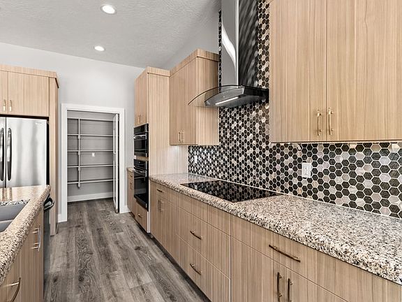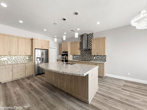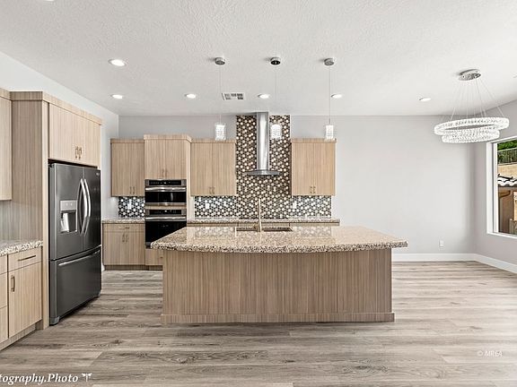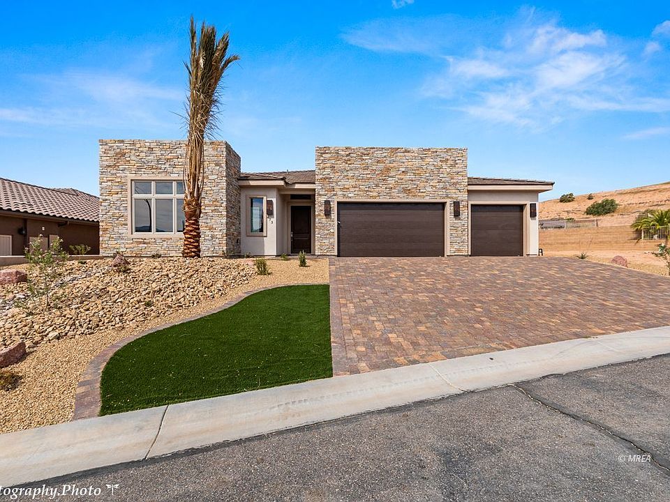 This gorgeous brand new custom home is situated on a spacious lot in Falcon Crest, a gated, golf course community north of I-15. Built by Viewpoint Contractors, the quality of construction is superb with 2 X 6 exterior walls and energy efficient materials. The home features clean lines and has a fun contemporary flair. The home functions as well as it looks with a spacious great room, designer kitchen, impressive pantry, well appointed main suite, luxurious bathrooms and eye catching cabinets, lighting, fixtures and flooring. The high ceilings and picture windows open the home up and add an abundance of natural light. Luxury vinyl and quality carpet line the floors and the paint tones and finishes are neutral. The main suite has a French Door to a large paver covered patio and the back yard is spacious allowing ample room for a swimming pool (already designed). The laundry room has upper and lower cabinets and a built-in ironing board. The exterior of the home is aesthetically pleasing with stone accents, paver surfaces, synthetic turf and beautiful landscaping. The 3 car garage is 844 square feet.