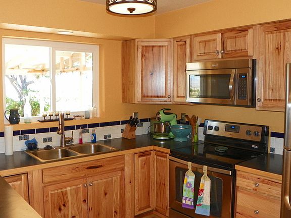 Updated with all new kitchen with beautiful Hickory cabinets and stainless steel appliances. Laminate floor and carpet in bedrooms. 2 Bedrooms plus an extra room that was a converted one car garage could easily be a 3rd bedroom. Covered front and rear patios to enjoy the views.
