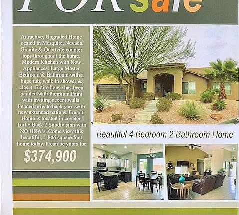 Beautiful, Upgraded, 4 Bedroom 2 Bathroom Home for Sale by Owner in Mesquite, Nevada. Granite & Quartzite counter tops throughout the home. Modern Kitchen with New Appliances. Large Master Bedroom & Bathroom with a Huge Tub, Walk in Shower & Closet. Entire House has been Painted with Premium Paint with Inviting Accent Walls. Fenced Private Back Yard with New Extended Patio & Fire Pit. Home is located in coveted Turtle Back 2 Subdivision with NO HOA's. Come View this Beautiful, 1,806 Square Foot Home Today. It can be yours for just $374,900 Call Yori Ludvigson 435-773-7180