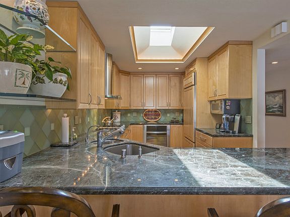 On the Water Front w/ wide open water views. Open floor plan with recently remodeled kitchen featuring clear maple cabinets, Verde San Lucas granite slabs & matching glass tile backsplash. SS appliance package includes Gaggenau cooktop, Milano Hood & 650 series Subzero refer. Refinished 5" Red birch floors. Master bedroom with sliding doors leading to patio with breathtaking views.