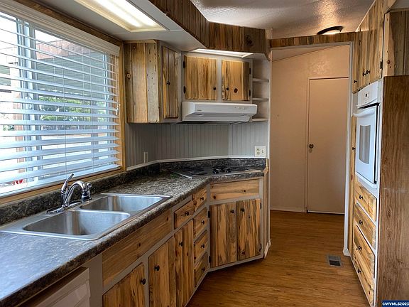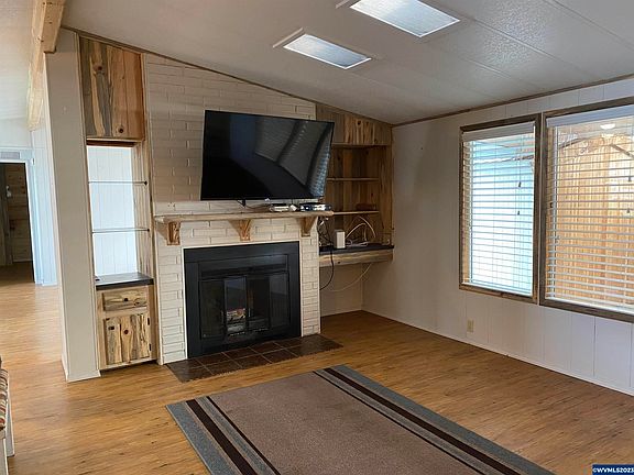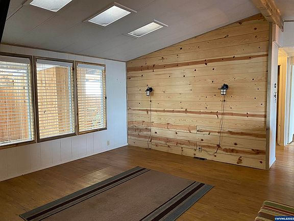 Knotty pine walls & cabinets, woodburning fireplace & laminate floors give remodeled Fuqua a spacious cabin feel on corner lot in Salem Greene's 55+ gated manufactured home park. Primary BR/BA off living room; 2 sp BRs (1 w/ Murphy bed)/BA off family room; formal dining & bar in kitchen. Unique features, built-ins galore, vinyl windows, heat pump (heats & cools), utility sink, pantry, metal roof, two covered decks—back one enclosed. Carport shed, separate shop & fenced yard for small pets.