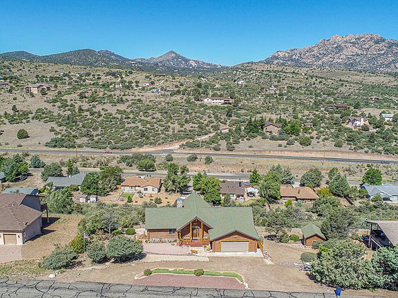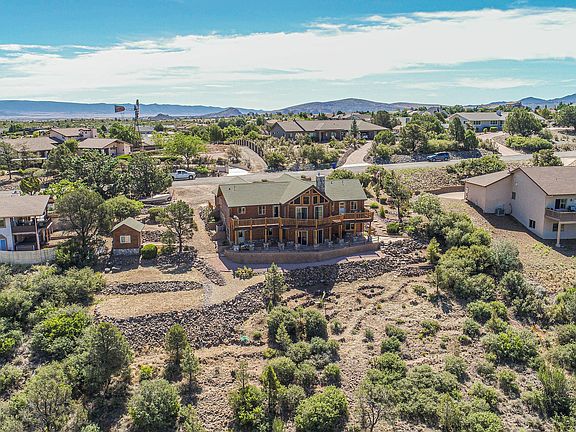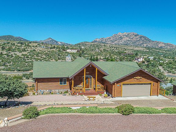 Enjoy magnificent views of Granite Mountain from the decks of this gorgeous custom log built home. Live the rustic feel lifestyle with modern amenities throughout the home! Upstairs offers main level living with an open floor plan which is great for entertaining, double sided stone fireplace, tongue and groove open beam ceilings, walnut cabinetry and hardwood flooring, jetted tub in master, cultured marble counters in baths, solid custom counters in kitchen called Mysteria. Down stairs offers 3 bedrooms, kitchenette, 2nd washer and dryer, family room with fireplace and a bonus room for gym or office. Outside access makes for ideal in-law set up or extended family living. The .81 acre property also offers RV parking and easy care landscaping. Enjoy every season in this beautiful home!