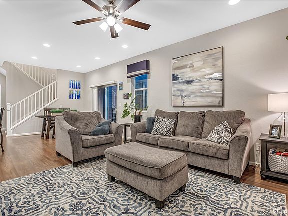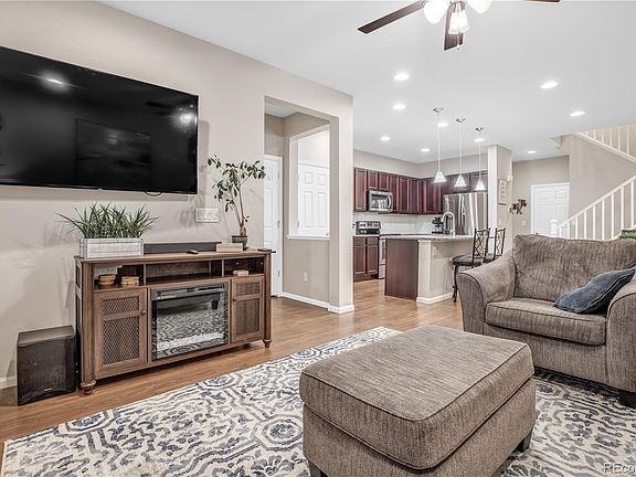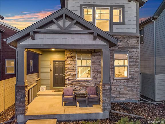This home has been Very Well Maintained. You are Welcomed into the home which offers an Abundance of Natural Light and Beautiful Wood Floors. Your Kitchen is nicely appointed with Granite Counters, All Stainless Steel Appliances, Pendant lighting over the convenient Breakfast Nook, lots of Cabinet Space, and more Wood Floors. The Main Level also has a Half Bath as you come in from the Garage. By the way, your Garage is 21' deep by 20' wide and has 2 remotes plus a keypad. Your Primary En-suite is 21'x14' and boasts a Spacious Bathroom, Double Sinks, and Luxury Vinyl Flooring. Don't forget the Expansive Walk-In Closet measuring 10'x6'. Both the 2nd & 3rd Bed are 11'x10' and each has a Walk-In closet. The Main Full Bath has Double Sinks with Luxury Vinyl Flooring. And you'll love the convenience of having the Laundry on the same level as the Bedrooms. Remember, this home has a Premium Benefit of having a Full Unfinished Basement to expand your living needs with Roughed in Plumbing for a Bath. Or, You may simply want to use it for much-needed storage without having to pay a monthly storage fee. This Home is located just steps away from the HUB Community Center which offers a Swimming Pool, BBQ area, Yoga, and More!! If you have a Dog you'll enjoy using the dog parks which can accommodate both small and large dogs and has convenient water fountains for your pets. You're also just 10-15 minutes away from DIA, lots of different shopping, Parks, Dining EZ Access to I-70, E-470 and So Much More!!