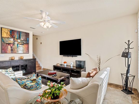 This beautiful townhouse is nestled within the gated community of Paloma Lakes, conveniently located right across the street from The Promenade. It boasts a picturesque view of the lake, visible from both the downstairs open porch and the upstairs open balcony in the main bedroom. The home offers 3 bedrooms and 2.5 full bathrooms, along with a 2-car garage, and plantation shutters throughout. You'll find porcelain flooring, a fire sprinkler system, and full hurricane protection for peace of mind. For added convenience, the laundry room featuring a full-size washer and dryer is situated on the second floor. The main bedroom includes his and hers walk-in closets, and one of the additional rooms comes equipped with a built-in office. This property is ideal for both end users and investors.