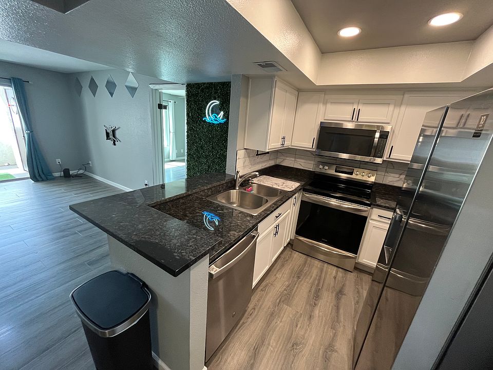 Welcome to this fully renovated 3-bed, 2-bath condo in the heart of Glendale. Upon entering you'll notice the spacious, open-concept floor-plan with large living space. The kitchen boasts black granite, marble tile backsplash, newer cabinets and stainless steel appliances. As you walk through you'll notice the sleek grey flooring, dual pane windows with blackout shades/curtains so you can sleep like a baby! Recently purchased LG washtower, fans with remotes in every single bedroom, large closets, and fully updated bathrooms with modern vanities and light fixtures. Every room has a unique luxury - The primary bedroom has a view of the pool, bedroom 2 has balcony access, and bedroom 3 has a large walk-in closet and is attached to the bathroom. 2 parking spots (one covered and one uncovered), with additional visitor parking if needed. Finish a busy day by stepping out onto your oversized balcony that has string lights and a built-in bar top so you can watch the AZ sunset with your favorite beverage in hand. The condo complex has some nice features such as a sparkling community pool and jacuzzi/spa. As well as an elevator to your second floor unit (yup - no need to take the stairs after a long day)! Also throughout the complex are cameras for extra safety and security. The community is very centrally located. 5 minutes to downtown Glendale and pretty much 15-20 minutes to everything else in the city - Downtown and Central PHX, Airport, Westgate District, ASU West, GCU, hiking, etc. Water, sewage, and HOA fees are included in price, tenant will pay their own electricity (SRP) and internet (Cox). Must demonstrate monthly income ~3x the rent, credit score of 590+, and no previous evictions/criminal record. Prefer non-smoker and no drug-use. The complex is quiet with many owners who live on site, so preferably a mature group of individuals or small family is ideal (5 people max). Tenant will pay first month and security deposit. We look forward to your application and hopefully calling this your new home!