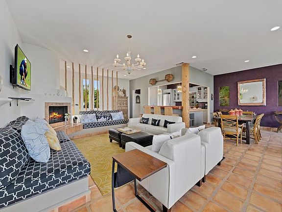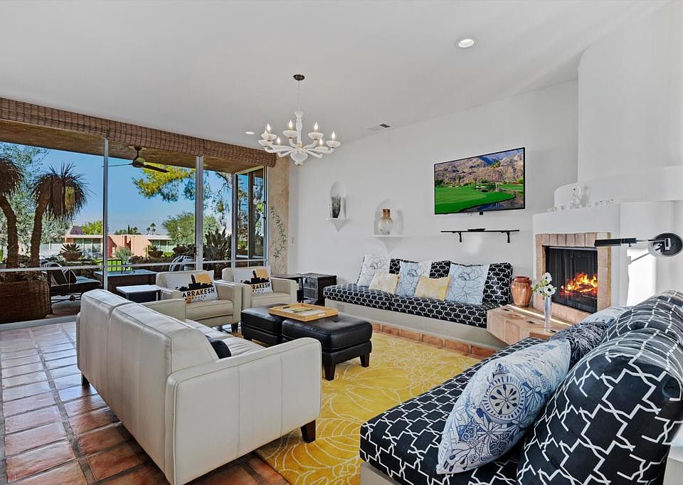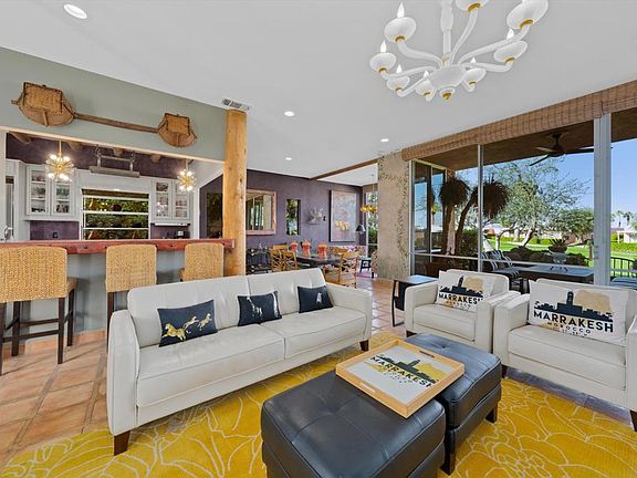 Nestled in the heart of the coveted Marrakesh, sits this greatly extended 2BR/2BA home waiting for you to make it your own! Featuring a relaxed eclectic and laid-back style with chic decor, creative use of rich earthy tones and a variety of unique accents and accessories. Once inside the oversized glass-paneled double doors, you'll find an open living space boasting expansive walls of glass and soaring ceilings. The open-style kitchen features a large skylight, a new gas cooktop and refrigerator, a microwave combo wall oven, and offers a terrific breakfast bar. The extended dining area features a gorgeous Murano chandelier and has an adjoining cozy sitting room - a perfect place to relax and converse. The living room with fireplace opens onto a private back terrace overlooking the immaculate golf course and our beautiful Chocolate Mountains. The enlarged owner's suite offers a walk-in closet with closet organizers and an atrium-style bathroom with a soaking tub. A spacious guest suite flaunts bold wild nature-themed decor and will nicely accommodate your extended family and friends. The enclosed south-facing front courtyard, with lush vines and a new built-in gas BBQ, you will truly enjoy as an extension of the home. New HVAC system, new water heater (2022), new plumbing, new ceiling fans, and much more! Easy access to the community pool right across the street. Membership benefits include golf, tennis, fitness, 14 pools, a doggie park and a clubhouse with unparalleled views.