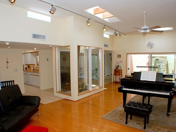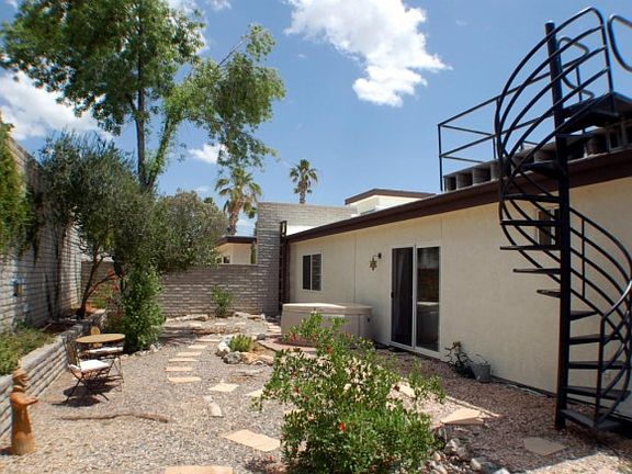True contemporary TH. Huge LR that looks out to patio w/ focal point of a fountain wall. Enjoy the FP, hardwood floors, atrium. Light from atriums, custom skylights & clerestory towers. DR w/wetbar. Remodeled spacious Euro kitchen w/ breakfast bar, pantry. Peaceful Master wing w/ walk in closet, vanity, dual sinks, oversized shower/tub, sitting room + office. On a 5227 sq ft lot. Roof top deck w/sitting area to enjoy views of MTN's, city lights, sunsets & star gazing. Features include 3 BR/2 BA + flex space for den/office space & sitting room, newer heat pump, dual pane windows, 10 skylights, recessed lighting, lots of storage & bookshelves. Comm pool & spa, Dist. 16 schools . Sunrise & Swan area. Owners prefer to occupy until after Xmas or after Easter due to work. Rent back considered