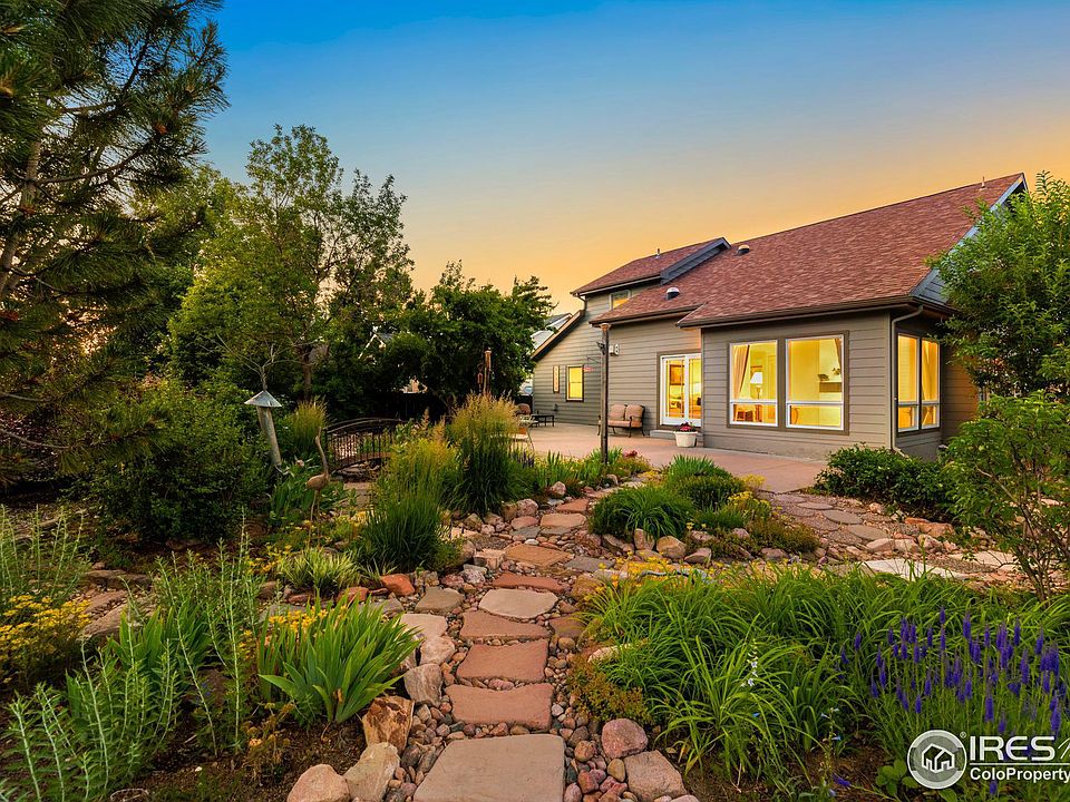 Don't miss this custom-built home on 0.36 acres that backs to private open space and is a gardener's paradise. Huge chef's kitchen with granite countertops, hickory cabinets, and butcher block, updates to bathrooms, engineered hardwood floors, solid-wood doors, vaulted ceilings, solar tubes, and fully finished garden-level basement. The formal primary bedroom on the main floor offers a very large walk-in closet and dual vanity in bathroom. Additional loft space upstairs adds additional living area to the floorplan and overlooks the living room below. Outside the home, the enormous backyard with myriad garden beds, yard space, fruit trees, grapevines, and rock areas help it to feel like a private oasis that does not back directly to neighbors and gives the homeowner access to the open space behind the property. Garage is truly oversized with extra deep bay. Neighborhood is moments from Cathy Fromme Prairie trails and the recently-built Fort Collins Montessori School around the corner in addition to shopping very nearby. Come see this beautiful home today!