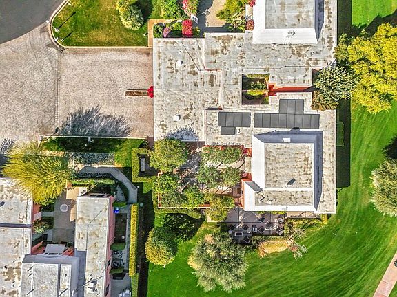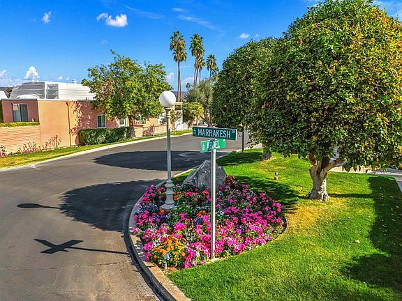 Presented in Beautiful Marrakesh Country Club, this Hollywood Regency Villa in a rare corner location features a long driveway and veiled iron gates opening to a charming south-facing courtyard with a citrus orchard and pathway leading to the iconic Marrakesh double front doors. This classic B plan is beautifully-updated and offers a separate foyer, pink marble-framed gas fireplace in living room, updated kitchen, and large bedrooms with walk-in closets. Floor to ceiling sliding glass doors and windows open the home to magnificent fairway views and glorious desert light. Enjoy the benefits of owned solar with double battery storage, enough to power your electric vehicles, with EV charger installed. The expansive leisure terrace with fire pit, located on the second green and third tee with dual fairway views that look out to Eisenhower Mountain, is an unique exclusive use elevated patio protected by a privacy hedge and shaded by decades old Marrakesh olive trees. This along with the southern exposure sunlight in your courtyard makes every location a destination. Marrakesh is a boutique country club with an ideal central valley location amongst a few of the desert's finest private clubs. Amenities include 18-hole private executive golf course, tennis, pickle ball, 14 pools and spa, a fitness center, and an active and newly-remodeled club house with fine dining. Marrakesh is near famous El Paseo with all of its elegant boutiques, restaurants, art galleries and coffee houses.
