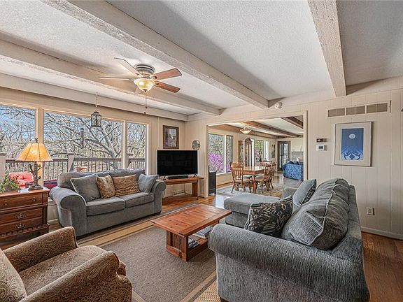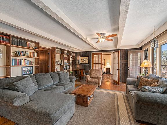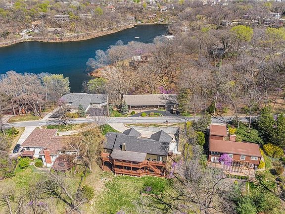 Wonderful waterfront home located on beautiful Black Swan Lake. Main level features open living space with large stone fireplace, boxed beam ceilings, updated kitchen with granite counter tops and tons of storage, large dining area with picture window and a spacious primary bedroom that opens to a large deck overlooking the shimmering 18 acre lake full of jumping fish and abundant wildlife. Plus, there is a fully finished walk-out lower level living area with two large bedrooms, an office/game room, sauna, family room, storage room and even more outdoor living space. A very rare opportunity to own on the lake and enjoy magnificent views from every window! Go fishing, paddle boarding, kayaking, swimming or lounge by the pool! Black Swan Estates is a collection of diverse architecture nestled in a picturesque hillside. A hidden gem like no other neighborhood with easy access to everything KC has to offer.