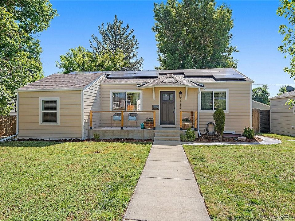 Fully Renovated Berkeley Bungalow Featuring 4 Beds, 3 Full Baths and Over 2,400 Finished Sq Ft. Rare Main Floor Layout Offering 3 Beds, Including Primary Retreat, 2 Baths and Dual Living Spaces. Kitchen Boasts Slab Granite Counters, Voluminous Cabinetry, Stainless Appliances, Full Height Tile Backsplash, Wine Rack, Stylish Vent Hood for Gas Range, Farmhouse and Bar Sinks. Primary Suite Accommodates a King Bed, Private En Suite, Generous Walk-In Closet with Sliding Barn Door and Secondary Closet with Additional Laundry Hookups. Contemporary Primary Bath Finishes with Frameless Glass Enclosure, Rain Shower Head, Double Vanity and Sleek Tile. Wood Burning Stove in Rear Living Room with Patio Doors and Block Windows Providing Abundant Natural Light. Fully Finished Basement Offers a Family Room, Office Space, Bedroom with Legal Egress, Full Bath, Laundry Room and Storage. Owned Solar Panels Yield Low Electric Bill. 6,890 Sq Ft Lot with Private Backyard, Large Patio, Garden Bed and Front Porch. Oversized Two Car Garage Providing Abundant Storage and Workshop Space. Impressive Walk and Bike Scores to Tennyson Street, Rocky Mountain Lake Park, Berkeley Lake & Dog Park, Scheitler Rec Center, Willis Case Golf Course, Dining and Entertainment on Lowell. Good Value in Northwest Denver for a Remodeled Home with this Number of Beds, Baths, Square Footage and Lot Size.