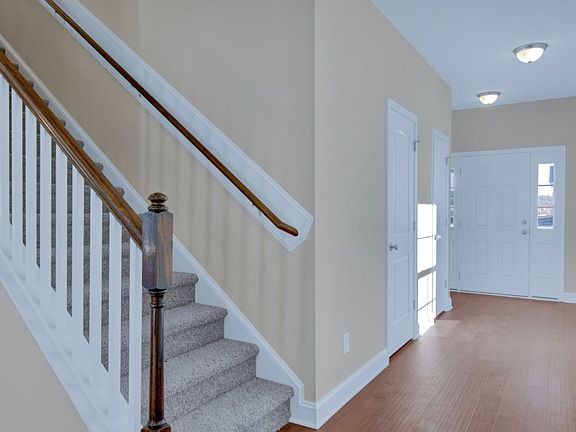 Great room with gas fireplace. Kitchen features granite countertops, tile backsplash, stainless steel microwave, dishwasher, and smooth top range, satin nickel finishes, and breakfast area with island. Covered porch and grill patio. All bedrooms on second floor. Master suite with tray ceiling, walk-in closet, his and hers sinks with cultured marble vanity, garden tub and separate shower and private water closet. Upstairs laundry room. Oversized garage. Hardwood flooring in foyer, dining room, kitchen, and great room. Low maintenance vinyl siding with shake accents, and stone skirt. Security system. Energy Plus certified with 1-2-10 year warranty.