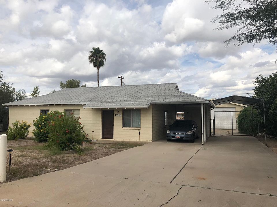 Mid-Century 3-bedroom brick home with huge yard and enormous garage/workshop -- only $125k + no HOA! Perfect for car enthusiast, hobbyist or someone who likes space to tinker - Would also make a great starter home or fix & flip. Centrally located, but on a quiet street - Boasts FIVE covered parking spaces - Bring your RV and toys! Tons of storage and 2 central vac units - 1 in house and 1 in workshop. Private backyard with 2 covered patios, RainBird irrigation system and beautiful citrus tree with oranges, grapefruit AND tangelos. Steel security doors on front and back, keypad entry to house, workshop and train room. Solid house with great bones, just needs some love ... Fantastic opportunity for someone handy to get a classic Tucson home for a phenomenal price!