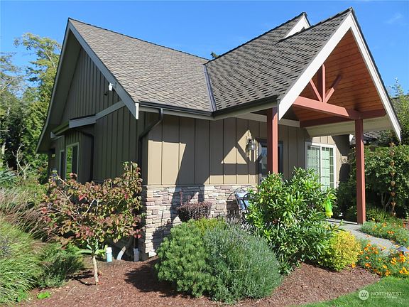 Birch Bay craftsman cottage style 2-story townhome end unit, The Tides at Birch Bay: sunny south-facing garden patio in front, back deck facing forested back yard. Private feel. Lushly landscaped community w/ outdoor pool & clubhouse less than 5 minutes to the Beach. Bay & spectacular sunsets visible from front community grass field. Well designed and stylish exterior cement plank siding, wood & stonework. Interior w/ great quartzite counters, rock surrounded fireplace, stainless appliances, vaulted ceiling & skylight. 1,156 SF, 2 BR. Full BA, 3/4 BA & 1/2 BA. Loft area can be an office. Paneled back deck overlooks, yard & trees sloping down to a creek. Storage off of deck. Near the seaside fun of Birch Bay beaches, restaurants and more!