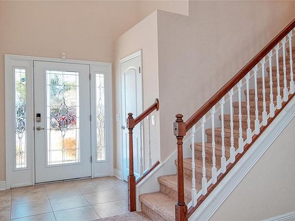 WELL LOCATED in gated Morgan Creek Preserve... walking distance to new Publix Shopping Center and minutes to I-4. Enter community with community pool, tennis courts and storage for boat, RV or trailer. Two-story Florida Contemporary has four bedrooms 2 1/2 baths with 2277 square feet of living area. Brick paved driveway and sidewalk welcome guest to open porch area. Enter home with wide foyer and hall closet. Spacious family room will hold a crowd with door that open to brick lanai area that overlooks backyard. Open kitchen with large center island is perfect for cooking family meals while being a part of family conversation. Plenty of room for bar stools, that serve as both impromptu meals or homework area. Kitchen includes stainless steel appliances, 42" cherry wood cabinets and large walk in pantry. Separate dining room with windows that overlook backyard. Downstairs laundry room with space for additional storage. Half bath downstairs for guest. Upstairs loft area allows for second family area to enjoy without being formal when guest arrive. Large master suite has newly built custom closet, a woman's dream. Master bath has his/her sinks, walk in shower and garden tub. Two upstairs bedrooms have walk in closet, great for additional storage. Open brick paved lanai overlooks ponds with fountain, perfect for days end. Double car garage with newly installed garage floor tiles, and plenty of custom built in cabinets. Call now for details!