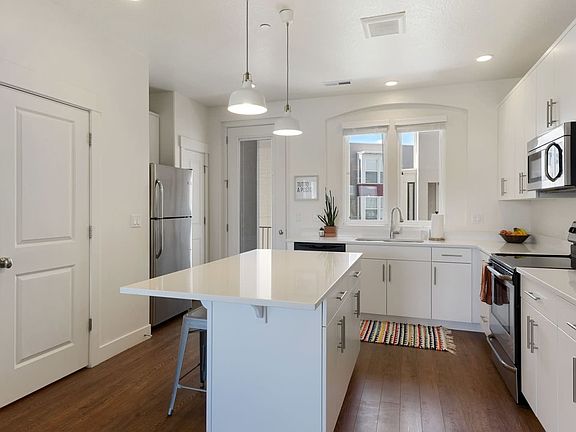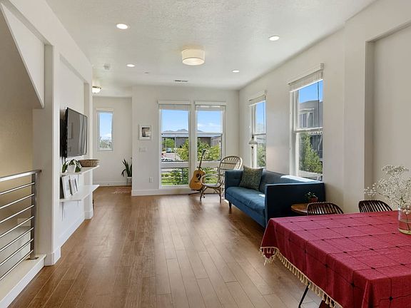 Highest and Best with a deadline of 5:00PM Monday. This Daybreak townhome offers floor-to-ceiling windows for an open feel with tons of natural light. It features quartz countertops throughout, an owner's suite with skylight and gorgeous views, and an office space with adjoining balcony. Included are stainless steel kitchen appliances, washer, dryer, and internal blinds in all doors. Right out front is a large, beautiful green space, steps away from shops.