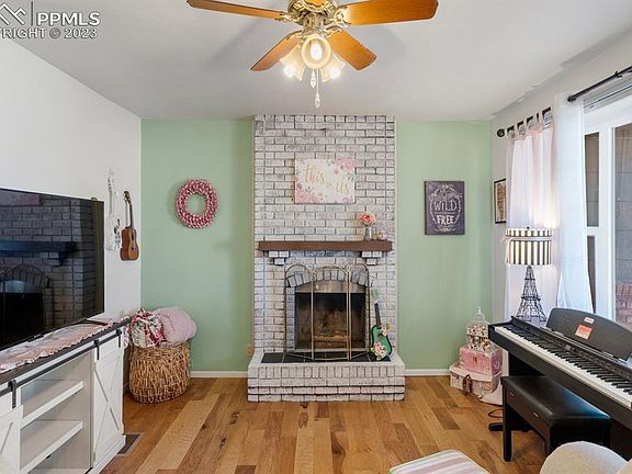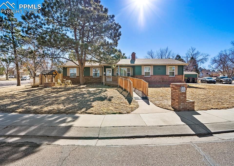 Fantastic home on corner lot with beautiful Pikes Peak views. This ranch style home offers an updated kitchen with granite counters, updated bathrooms, 2 fireplaces - one in living room (decoration only) and one in basement, beautiful wood laminate flooring on main level, newer carpet in finished basement, newer interior paint, new electrical panel (2021) and new AC (2022). The back yard is ideal for entertaining with a cement patio and firepit. The home is also handicap accessible with ramp access in front of home. No HOA! Property is centrally located close to schools, parks, hiking, shopping and restaurants. Minutes to Peterson Space Force Base and Schriever AF Base.