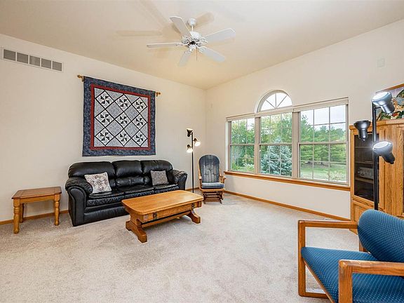 Spacious well-maintained Windsor Ridge ranch abutting open space and trails near south pond. Great room with vaulted ceiling, sunroom with french doors and plenitful southern/eastern exposure windows. Kitchen has great work space and cozy built in dining area with banquette seating. Large primary bedroom ensuite with two seperate closets.. Walkout basement with large gathering room graced by brick fireplace and built-in shelving with unique stained glass doors. Private screened-in porch. Half of basement is unfinished with room for a 4th bedroom and excellent storage space. Garage has space for 2 vehicles, and an extra stall now used for a workshop, but could add a garage door for third car. Wonderful periennial plantings, mature trees and elevated garden beds.