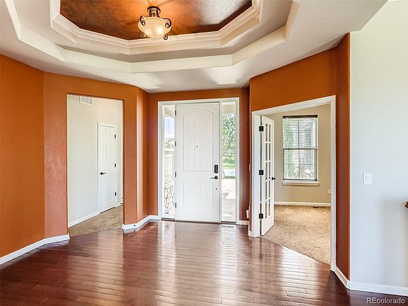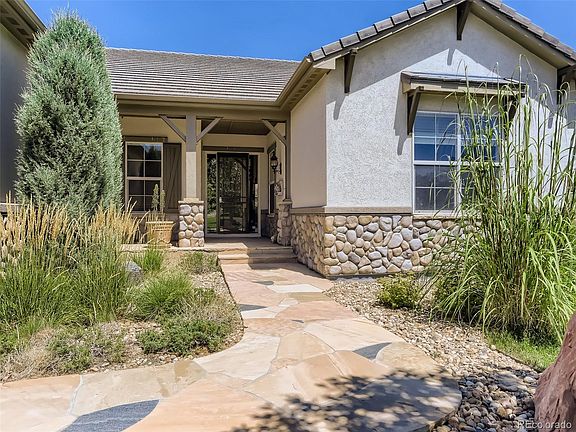 Anthem Ranch Vail Model Home backing to a greenbelt with Mountain Views! Over 3500 sq ft finished, this home offers easy main floor living with a spacious open floorplan. Gourmet Kitchen boasts a gas cooktop, double ovens, stainless steel Kitchenaid Appliances, large pantry, lots of granite counters for workspace, breakfast bar and eat in kitchen. Large separate dining room adjacent to the kitchen with built in granite buffet bar perfect for entertaining and area for dining room buffet cabinet. The large living room has extended hardwood floors, cozy gas fireplace with designed stacked stone and mantle. You are welcomed into this home with a beautiful entryway with rounded tray ceiling and large office with french doors. 2 sets of sliding glass doors bring you to an inviting covered deck backing to a quiet beautifully landscaped common area and a spot to enjoy the Colorado Sunsets. The primary bedroom offers crown moulding, door to the out door deck, 5 piece bath with tile and walk in closet . 2nd bedroom is spacious adjacent to a 2nd full bath and a private area on the front of the home. The finished basement is a plus with a large recreation room, bar area and lots of storage or future finishing. This home comes with an additional 1/2 bath on the main level, laundry room with sink and extra cabinets and 2 storage closets for the extras! 3 car garage is perfect for your bikes, toys and storage. Mature landscaping, front flagstone walkway added along with storm/screen door. 30,0000 sq ft Aspen Lodge Recreation Center, indoor/outdoor pools and hot tubs, over 130 clubs and tons of exercise classes. A full social calendar with outdoor concerts and activities Tennis, pickleball, biking and hiking clubs and more. Close to Denver, Boulder, DIA, shopping and restuarants and over 48 miles of trails around the neighborhood. A rare location with tons of privacy.