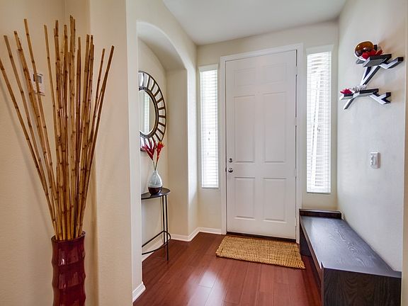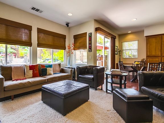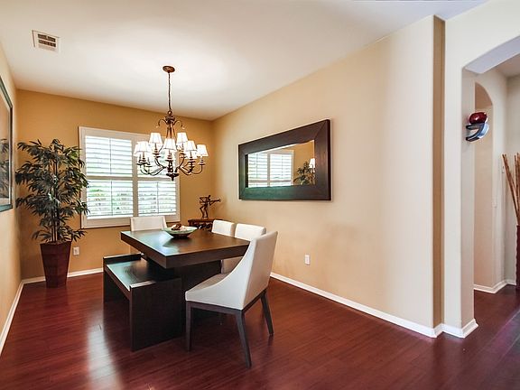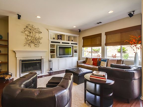 The elegance of this well appointed 4 bedroom, 3 bath, 2160 sq ft home, with a ground floor master suite, is immediately apparent. Dark bamboo wood flooring, tasteful granite counters, designer lighting, stainless steel appliances, plantation shutters, a beautiful built-in BBQ and outdoor bar, custom hardscape with a private and cozy gas fire pit area, mature tropical plants and a bright and open back yard. The home also has a peaceful location on the street and just steps away from the community pool. It has a very livable, open floor plan with the kitchen connecting to the comfortable family room and fireplace area, which features a custom built-in entertainment unit and is wired for surround sound. It also features a guest bedroom and full bath on the ground floor. This home is perfectly set up for great indoor-outdoor living with a door from the great room area out to the north-facing backyard and patio. The outdoor BBQ and bar is just outside the sliding door for easy kitchen access. The home has a nice sized grass area out back, great for play and pets. This desirable property is located within a few minutes of award winning elementary and middle schools. It’s also just a short walk to the new highly rated Sage Creek High School, focusing on S.T.E.M. studies. You can also walk to the Calavera Hills Preserve nature and open space area. It has wonderful hiking and biking trails and a lake. Also close by is the Calavera Hills Community Center with ball parks, a gymnasium, tennis courts, a playground and much more. It is one of the venues for the popular Summer Jazz Concerts in the Park. This fabulous property has easy access to freeways, shopping, restaurants and all amenities, including the beach!