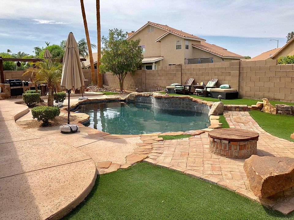 Entertainers Dream! This is not your average rental home. This spacious 3bed/2bath split floorplan features elevated ceilings, wood-look tile flooring throughout, gourmet kitchen with infinity edge granite countertops and top of the line appliances. Large master suite with private bathroom features walk-in shower and walk-in closet. Laundry room with washer and dryer. Amazing backyard complete with private pool, outdoor kitchen, fire-pit area, tropical landscaping and full length covered patio! Call today for a private showing. Owner Pays Pool and Landscape Maintenance