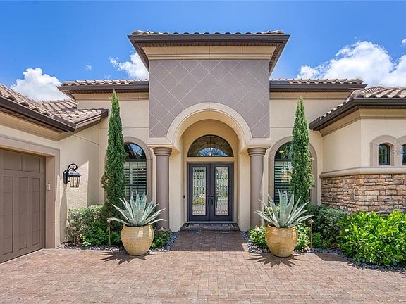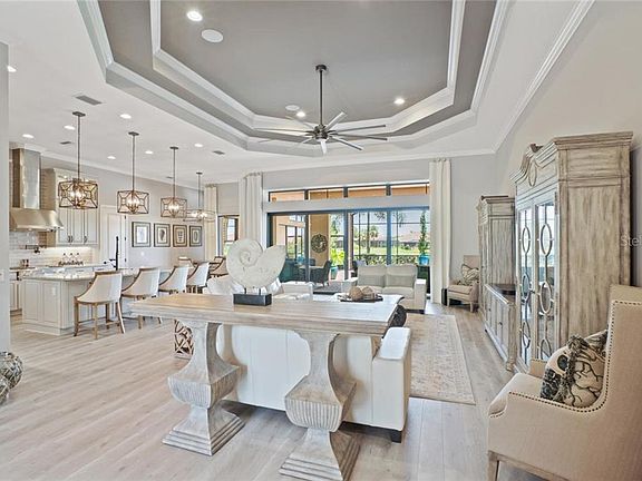 Majestically positioned with a golf course and lake view in the desirable Esplanade community of Lakewood Ranch, this phenomenal 2018 Taylor Morrison residence epitomizes the meaning of Florida affluence. Stunning curb appeal sets the scene for an inviting atmosphere where upgraded landscaping and lighting package leads you to a glass double designer front door entering you into a domain of grandeur and comfort. A plethora of custom enhancements has been thoughtfully completed throughout the home to improve the quality of everyday living. Ascending ceilings with recessed lighting, trendy Mohawk wood-like floors, sophisticated aesthetics and design finishes, and captivating views through disappearing sliders create a mesmerizing space in the open concept layout. The great room, kitchen, nook and dining room share the stage as the outdoors are brought inside for effortlessly shared living space on the elaborate screened lanai. A culinary masterpiece, the gourmet kitchen marvels that of a magazine cover with beautiful stacked upper glass display cabinetry, under cabinet lighting, built-in GE Monogram appliances including a cooktop with griddle and pot filler, center island with an apron-front stainless-steel sink, and pantry with wood shelving. Ideal for entertaining and self-indulgence, you will never want to leave home. Spend countless hours lounging by the PebbleTec saltwater pool with three water features and cook in the outdoor kitchen featuring a Fire Magic Grill, burners, vented hood, sinks and two refrigerators. Whether gaming, having a private concert or binging your favorite movies, the theater room boasts a tiered stage with 8 high-end Seat Craft Serenity leather motorized seats, 86" Sony Bravia with Tru Vision hi-def TV, sound system, acoustic wall, trim package, masterfully crafted built-in cabinetry, a bar including a wine fridge, granite counters, LED lights, console with granite under the TV with glass doors for remote access, and black-out shades. A sanctuary of peace, the master suite features a double-door entry, walk-in closets, and upgraded finishes in the spa en-suite bath with a dry sauna. Two additional bedrooms and two and a half bathrooms are private and generously sized to please guests and fit your lifestyle needs. The list of luxe details and inclusive features could go on and on. This residence raises the standards of a life of excellence in a community that truly lets you have it all. As a resident of Esplanade Golf & Country Club, you will enjoy over the top amenities including a new Culinary Center, fitness center, clubhouse, an array of dining venues including the Bahama Bar, sports and tennis courts, lagoon-style pool, Wellness Center and Spa, and with this home, golf membership is deeded to you as well!