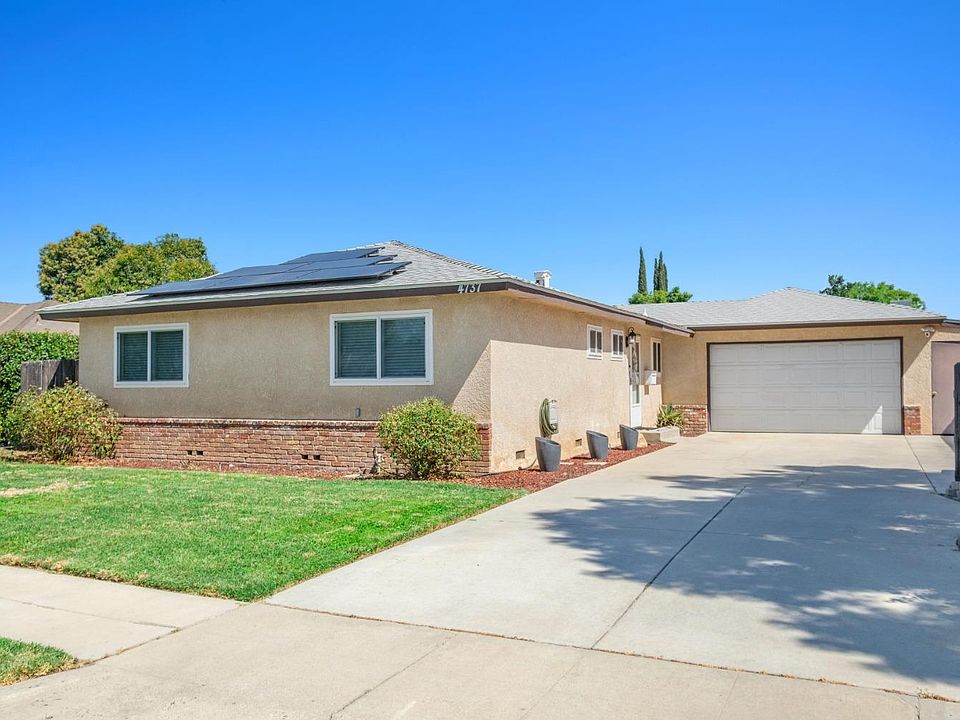 This home features 3 bedrooms, 1.75 bathrooms, with newer roof and owned solar. The interior has been recently updated with wood looking vinyl flooring, newer plumbing and light fixtures. The kitchen features a stainless steel gas stove/oven, breakfast bar and dine in eating area that is open to the living room with a view of the fireplace with custom mantle and the back patio. Enjoy the outdoors with a concrete covered patio, or on the extended patio area with pavers and gazebo or on the grass area. The laundry is located in the garage and is attached the house complete with a bonus storage/shop area.