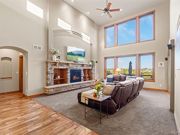 Enjoy spectacular mountain views all year round with gorgeous 360º sunrises and sunsets! Located in the coveted Sky Rim neighborhood, this home is perfectly situated on a quiet cul-da-sac backing to an open space filled with hundreds of mature pine trees which offer both plenty of privacy and beautiful scenery. Custom, high-end upgrades throughout including acacia hardwood floors and plush carpets, the finest (and largest!) Renewal by Anderson windows and doors, Hunter Douglas custom window treatments, and a luxury Mendota fireplace. This home features a main floor master suite with spacious, 5-piece bath and California closet. The open floorplan boasts with both high and vaulted ceilings throughout the entire home. This home provides an abundance of natural lighting on all levels – including that of the garden-level basement. The kitchen and master suite open to the Trex-like, custom deck which overlooks the beautiful Rockies. Enjoy gorgeous scenic views during your morning coffee or during dinner al fresco. The property sits high up on 5 acres and is fenced to include your yard with playset, a chicken run and coop (making eggs affordable again!), vegetable and flower garden, and apple orchard! Tons of storage throughout including the four car garage, multiple linen and coat closets and the basement storage area temperature fitted for food storage. Take your garden and orchard harvest and enjoy year round! This home includes a commercial-grade electrical panel, back up generator, and in-house water filtration system.