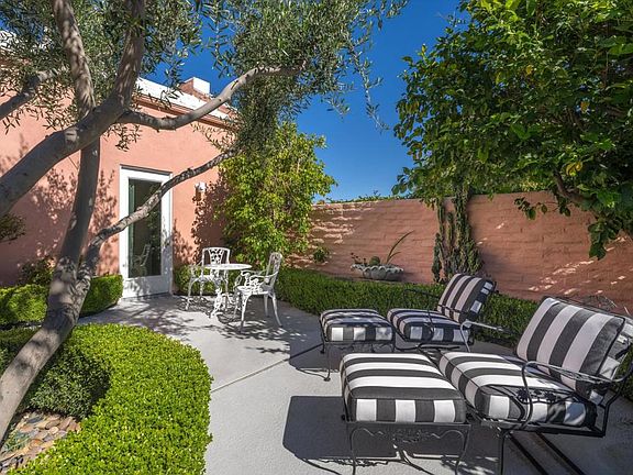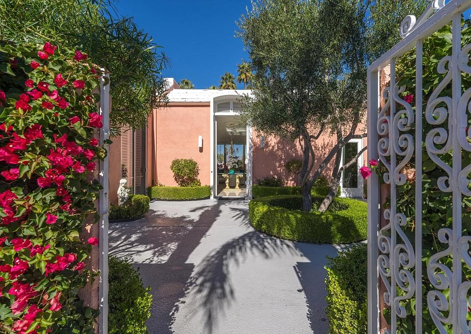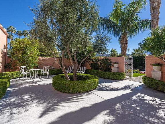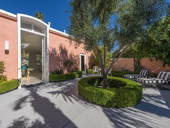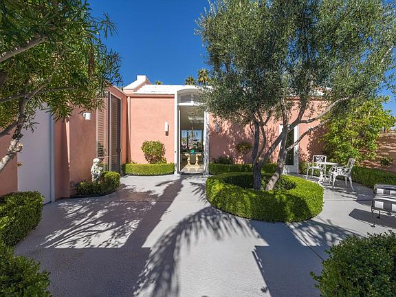 Experience the splendid country club living in this beautiful Hollywood Regency residence, designed for those who appreciate the elegance of a bygone era seamlessly blended with modern lifestyle. Enter through the private courtyard gate and find yourself in a serene oasis, surrounded by lush foliage and views of the Eastern and Southern mountains. Soaring front doors lead into an elegant living area adorned with modern white porcelain tile floors, complemented by large baseboards and crown moldings. The stacking walls of glass open on to a back terrace, just steps away from the glittering saltwater pool, offering the luxurious feeling of a private retreat. The updated kitchen, which flows into a cozy sitting area, provides the perfect setting for relaxation, while the enlarged arched opening reveals two generously-sized bedroom suites, each exuding its own charm and character. The Primary Suite is a nod to John Elgin Woolf's exquisite architectural design, complete with an enlarged glass walk-in shower and direct access to a walk-in closet. The second bedroom has been transformed into a spacious Guest Suite with a comfortable TV viewing area and an office space. An additional powder room with shower offers easy access from the pool area, enhancing the seamless indoor-outdoor lifestyle. Enjoy a variety of club amenities including golf, fitness, tennis, 14 pools and spas and a newly remodeled clubhouse, all set against a backdrop of magnificent views of San Jacinto Mountains.