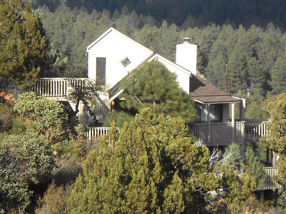 Privacy with A View! There is also a cozy 2 bedroom, 2 bath cabin included. Massive wraparound partly covered decks out every door on both levels, with 210 degree views from the head of the canyon, over downtown Pine, all the way to Four Peaks. Inside, there is a vaulted ceiling, lots of natural wood, a fireplace and a loft. Below the deck there is a workshop/storage building. A large common area encompasses 2 sides of the property, and the second lot provide almost total privacy. Most furniture and fixtures convey.