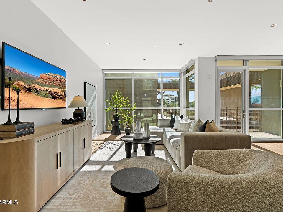 Modern Luxury Condo in the Heart of Old Town Scottsdale: Safari Drive. Experience upscale living in this newly renovated (2021) condo at the sought-after Safari Drive Condominiums. Boasting a refined contemporary design, this stunning residence features floor-to-ceiling windows in every room, flooding the space with natural light and showcasing beautiful wide plank French oak floors throughout. The gourmet kitchen is a chef's dream, highlighted by sleek Scavolini cabinetry, striking Calacatta Bianco quartz countertops with a dramatic waterfall edge, and a Calacatta marble mosaic backsplash. Premium appliances include a Sub-Zero refrigerator, Bosch cooktop, hood, oven, microwave, and a Miele dishwasher—all seamlessly integrated into this elegant, high-functioning space. Retreat to the spa spacious primary suite, complete with an oversized walk-in closet and a spa-inspired bathroom outfitted with Italian porcelain tile, white quartz countertops, and luxurious Waterworks fixtures. California Closets have custom-designed storage throughout the unitincluding in the primary suite, guest room, front hallway, and pantry; for ultimate organization. Enjoy two private balconies overlooking a tranquil courtyardperfect for morning coffee or evening relaxation. Residents of Safari Drive enjoy exceptional amenities, including two sparkling pools, a newly renovated fitness center, and a prime location just steps from Scottsdale's top shopping, dining, and entertainment. Additional features: Two dedicated parking spots, move-in ready with timeless modern finishes, located in the heart of Old Town Scottsdale. Don't miss this rare opportunity to own a designer-renovated condo in one of Scottsdale's most desirable communities!