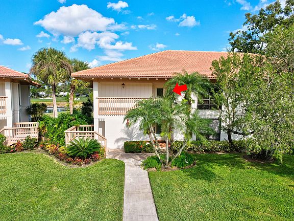 Highly sought-after Tennis Villa boasting spectacular views of water and the first fairway of the Staple golf course. Wall between the living room and dining area has been removed, providing an open concept living/dining area. Kitchen has been partially remodeled. Primary bathroom includes a Kohler walk-in Tub and separate shower. Newer washer, dryer, hot water heater, flooring throughout, primary bedroom window and front door. Just a short walk to the PGA Resort - come see for yourself!