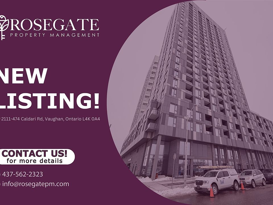 1-Bedroom + Den Condo with Free Internet & Balcony in Vaughan Welcome to 2111-474 Caldari Rd, Vaughan a bright and modern 1-bedroom + den, 1-bathroom condominium offering 600 sq. ft. of well-designed living space. Ideal for professionals, singles, or couples, this condo combines comfort, convenience, and functionality in a prime Vaughan location.The open-concept layout features a spacious living area, a contemporary kitchen, and a versatile den that can serve as a home office or guest space. The private balcony offers the perfect spot to relax and enjoy fresh air, while large windows ensure the space is filled with natural light.Additional perks include free internet and 1 dedicated parking spot, providing added convenience and peace of mind. Professionally managed by Rosegate Property Management, this condo is located close to shopping, transit, parks, and local amenitiesoffering the ideal balance of style, comfort, and accessibility.A move-in-ready home in Vaughanbook your showing today!
