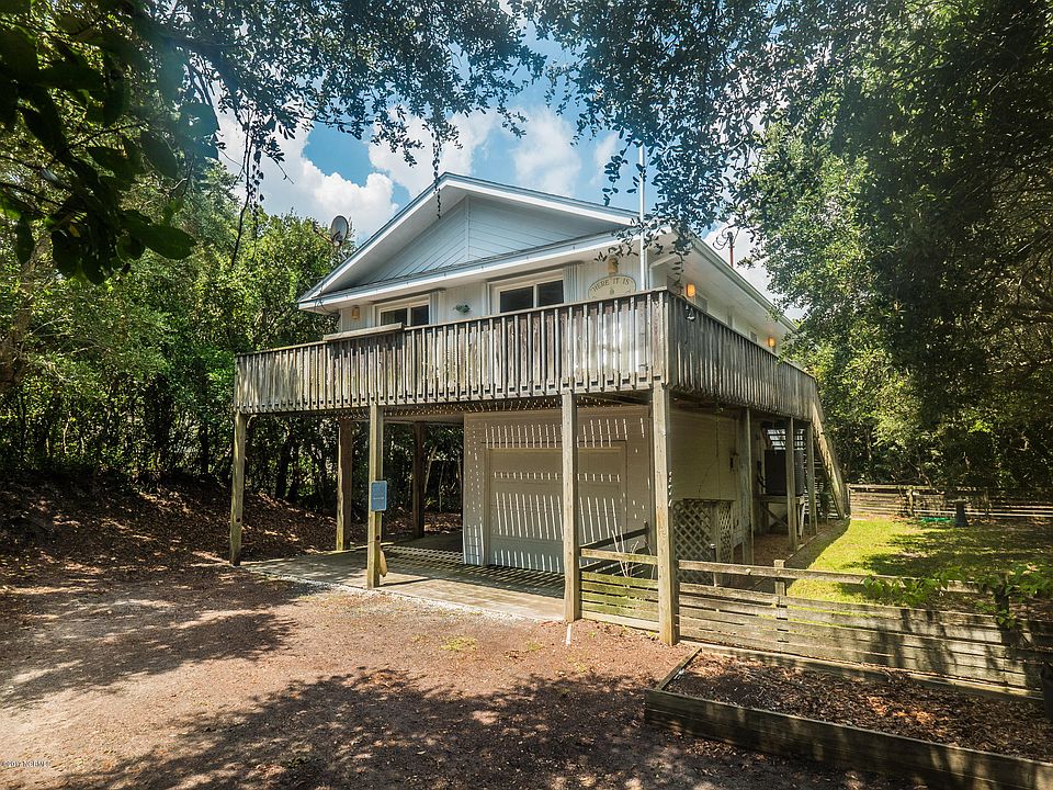 Cozy, convenient and nestled in the maritime forest just across from the beach. Come see this Topsail Cottage with pine floors and ceilings. Great living space with vaulted ceilings, sliding glass doors and open decking as well as covered lower level area for cookouts and games. House has the nautical feel you would expect and with a few simple updates, it can have that coastal shabby chic look! Two parcels convey with this listing including the deeded beach access. 96 feet of frontage by 200 feet of depth is a rare find on Topsail second row! What would you do with that much land! Enjoy this present home for years and then you have the option for a grand home with sweeping views with a reverse plan. Elevator makes getting those groceries and luggage up stairs a pleasure.