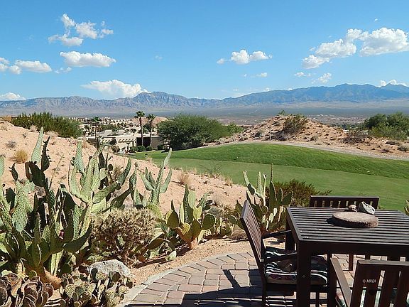 One of the most stunning views that you will find in Mesquite. Sitting above the Oasis Golf course, you will experience a front row view of the southern Virgin Mountains. Enjoy the gated Ventana subdivision, where having actual green grass is not a sin. The owner, a retired New York opera singer, has lived in the home 17 years, so excuse a little over collecting. Into golf?, there is a separate golfcart garage door at the front of the 2-car garage. Other features include an entry courtyard, water softener, sink in the garage and fireplace in the living room.