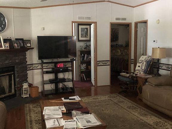 This home is a 1998 Clayton DOUBLEWIDE that is on a permanent block foundation. It has clay siding, three bedrooms with two baths, 8Ã--16 covered front porch. Hardwood and carpeting, double pane windows that tilt in for cleaning. 6 panel interior doors, appliances with microwave, wooden blinds throughout home. Ceiling fans I all rooms, 8 camera surveillance. Two car garage with small work shop that is 26Ã--28. 10 ft covered breezeway around back of house. New generac for backup when power is off. Metal roof, laundry room, all black topped from highway to garage. Wall in front just redone. 30Ã--44 metal garage up on hill and a double carport, 75,000 btu shop furnace and has a half bath.
