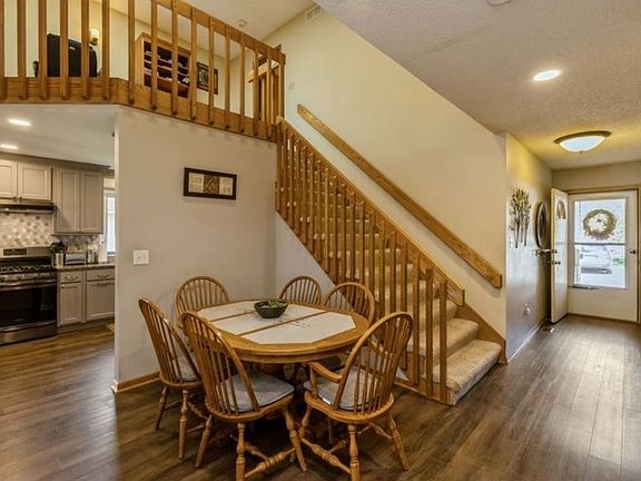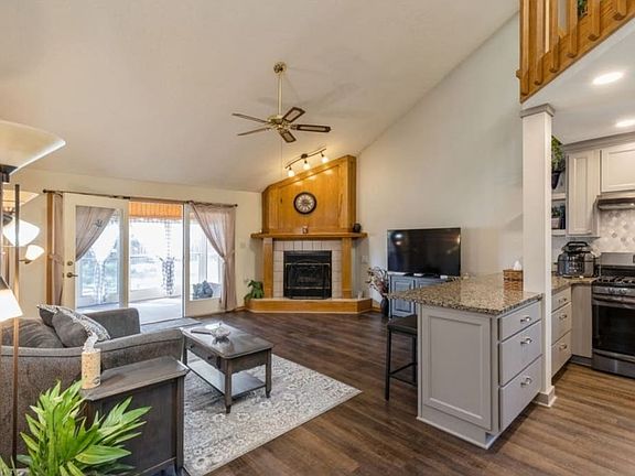 End unit, spacious & immaculate 1.5 story townhome. The family room & kitchen are open concept w/two story vaulted ceilings. Newly remodeled kitchen features new grey cabinets, granite counters, backsplash & appliances. Main level features gorgeous new LVP, cozy fireplace, 2 bedrooms, full bath & large laundry room. You will love lounging in the 3-season room, which offers lots of natural lighting and overlooks your large backyard. Upstairs is a loft space perfect for an office, spacious bedroom w/2 closets & full bathroom. The large basement area offers lots of storage area or is ready for you to finish! Nice quiet location near shopping, restaurants, parks & interstate access. Call today for your private showing!