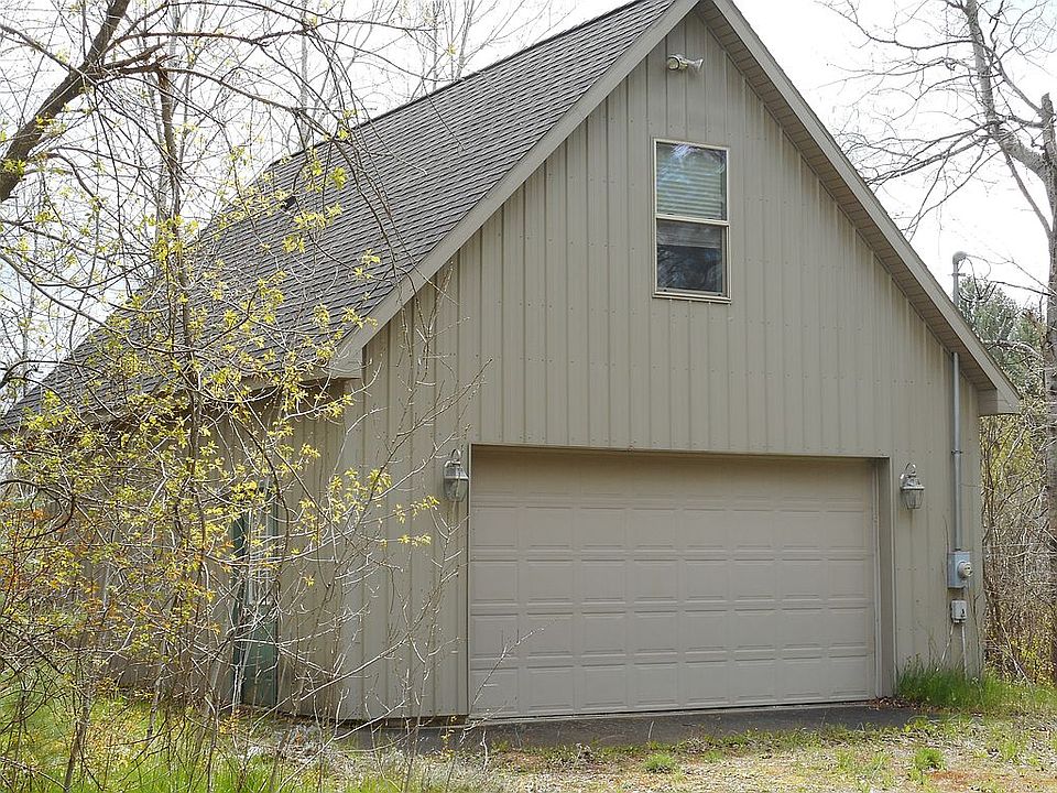 Situated on 7 acres of totally private and beautiful land just outside of Cadillac. This tastefully finished pole barn has living quarters above which can be used as residence while main house is being built on partially cleared portion of property behind. Possibilities abound! Can be used as a guest house or rented as an apartment but with a two car garage below! Can be used to store cars or a boat! Garage has almost finished dry wall, cement floor and new paint. Living quarters include full kitchen with stove with outside exhaust fan, full size fridge with ice maker hooked up, oak cabinets. Living area with sky lights, new laminate countertops. Laminate wood flooring. One bedroom with window and closet. First floor has bathroom with toilet, shower sink and washer/dryer hookup available. Also has a raised balcony on second floor overlooking woodlands. Furnace with central heat. Minor finishing is required but it is clean and very cozy! Please inquire for all the details! If you like your privacy with 7 acres of woodland around you but close to town this is it!