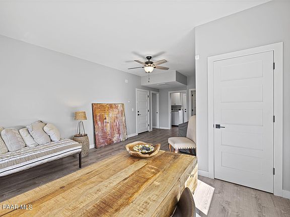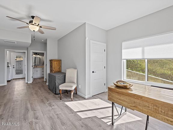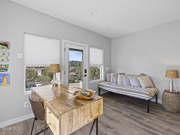 SOLAR SELLER OWNED. Step into a blend of panoramic views and modern living in Diamond Valley, at its finest! This gem boasts an open floor plan with quartz countertops & solid wooden cabinets. The luminous upper level features wood plank vinyl, up to 12ft vaulted ceilings, and oversized windows. A chef's dream kitchen shines with stainless-steel appliances and innovative kitchen storage with Lazy Susan's in all corners. The master suite, accentuated by a barn door entry, reveals a spacious deck. The ensuite bath is luxury personified with dual vanities and a walk-in shower. The lower level offers a versatile space, doubling as a cozy living area and office. Completed with a 2-car garage and a solar-equipped metal roof for energy savings. Experience unmatched Arizona luxury!