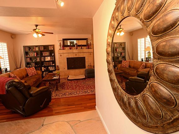 NO HOA..This beautiful home awaits your arrival on 1.21 AC with city lights and mountain views.Bright and open floor plan with foyer of flagstone flooring greets you. Formal living and family room have beautiful mesquite flooring. Home has two masters, which one could serve as guest suite. Main master allows you to step down into complete privacy plus its own patio. The gourmet kitchen is loaded with cabinets and roll outs, granite counter tops, top of the line appliances, prep sink and more. Formal dining room has access thru doors to outside for extended use. Walk thru the professional designed backyard with city lights and enjoy. The four car garage will delight any man. One bay is a work shop and all storage and cabinets stay. Form more information please see attached flyer.