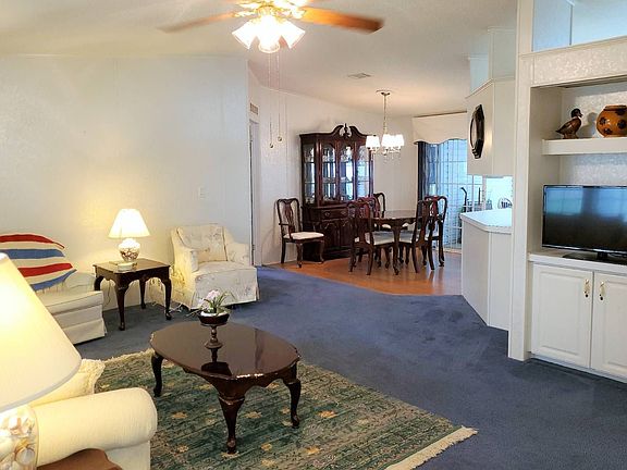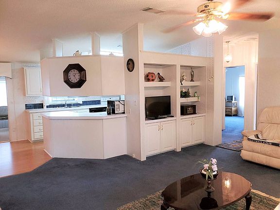 NEW ROOF AND A/C WITH TRANSFERABLE WARRANTY. 3/2 HOME IS 1428 SQUARE FEET WITH A 12 X 9 INSULATED FLORIDA ROOM: BLINDS AND FAN FOR OPTIMAL OUTDOOR LIVING, AND A 10 X 18 FL ROOM/ENTRYWAY. KITCHEN has a brand new refrigerator in 2019, and custom ice maker/water line 2016. Washer & Dryer 2016. DINING ROOM has laminate flooring, custom blinds & window treatments, seating for 6 with leaf, and china cabinet complete with formal china and glassware set. MASTER has an extra long wall-to-wall deep closet and is large enough for a King set. MASTER BATH has a soaker tub, walk-in shower with 2 seats, and 4 windows for a lot of natural light. LIVING ROOM has a full size sofa, two chairs, one recliner, 4 end tables, coffee table, and built-in, lighted entertainment center with shelving. 2ND BEDROOM has a full size bed, night stand, dresser, large closet, and fan. 3RD BEDROOM is large enough for a queen size set, and has a fan and large closet. LAUDRY ROOM is off the kitchen laminate flooring, cabinets, and GE washer/dryer are only 3 years old; rarely used. MAKE AN OFFER OR SCHEDULE YOUR SHOWING TODAY. OWNERS ARE HIGHLY MOTIVATED TO SELL! CRYSTAL LAKE IS A 55+ LAND LEASE COMMUNITY. This is a pet-friendly ( 1 dog/1 cat under 30lbs) 55+ retirement mobile home community. Packed full of exciting amenities such as an on-site fitness center, game room, community swimming pool, shuffle board courts, picnic areas, fishing, and hot tub.