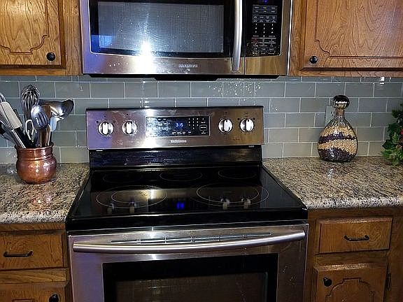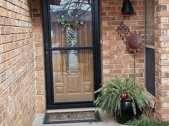Granite counter tops in kitchen, bathrooms and makeup area. Glass subway tile in kitchen. Updated bathrooms and kitchen. Wood laminate flooring in kitchen and dining room. Rest of rooms carpeted and bathrooms tiled. New light fixtures and fencing on 3 sides. Back fence 7 feet tall for privacy. Auto outdoor front lights. Large master bedroom with walk-in closet. Lovely landscaping and water sprinkler front and backyard. Security system. New roof, gutters, garage door and some exterior paint 10/2024. Tornado shelter in garage. New heat and air, water heater 2023. Outdoor shed.