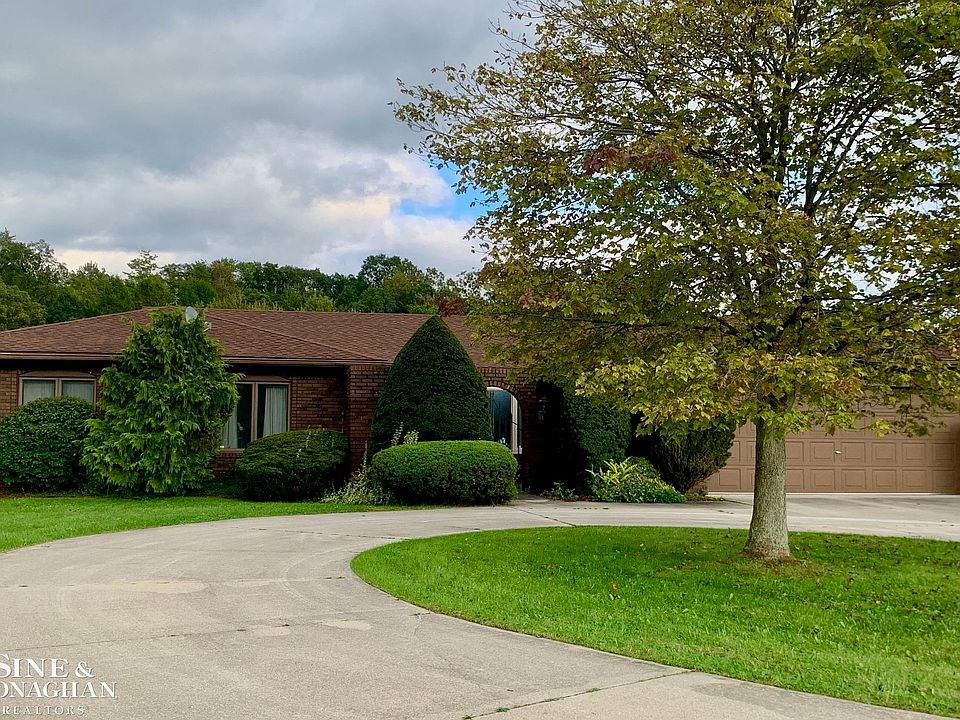 A long cement driveway leads you to 10.15 acres of peaceful country living together with an all brick 1,900+ square feet ranch waiting for you to put your personal touch on it! 3 bedroom, 2 bath, and a den/office make for a spacious layout. A dining room plus kitchen counter seating provide for lots of room to entertain! A wood burning fireplace completes the living room. Kitchen has tons of storage with an updated stainless steel refrigerator. Built-in microwave and oven offer a bit of uniqueness in this spacious kitchen. A full partially finished basement with a wet bar and pool table (pool table stays) for all of your recreational/game room needs. A storage room, workshop space, canning storage closet, and an additional bathroom with walk-in sauna all found in your own lower level. An approximate 1,000 sq. ft. barn with lean-to for all of your storage and workshop needs. A large pond with fountain and electricity at dock. Geothermal boiler system, water softener system and newer roof (4-5 years old). Original owner. Make this your forever home!